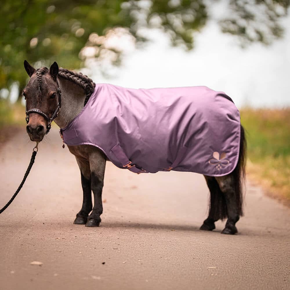 Deine neue wasserdichte Lieblingsdecke in Flieder, die dein Shetty vor Regen und kalter Luft schützt. Du hast die Wahl aus Standardmaßen oder aber du gibst uns deine Maße durch, damit alles perfekt passt. Von 0gr bis kuschelig warm mit 150gr Füllung. Wahlweise mit Details in Silber, Gold oder Roségold.