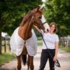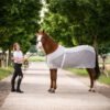 Die perfekte Decke zum Transport und für den Schutz vor Insekten. Nachhaltig gedacht besteht diese Decke aus recyceltem Mesh. Am Rücken und Halsauschnitt befindet sich Fleece, der den Rücken des Pferdes schützt, somit eignet sich die Decke auch perfekt zum Transport an wärmeren Tagen. Einfassung mit farblich abgestimmten Viskosekordeln. Damit nichts scheuert, befindet sich ein kleines Teddyfell am Widerrist. Mit Logostickerei auf der linken Seite.