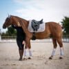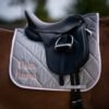 Anatomisch geformte Schabracke aus Velour. Gefüllt mit Schaumstoff und Volumenvlies für eine bessere Stoßabsorbation. Unterstoff aus 100% Baumwoll- Waffelpiqué, das den Schweiß schnell aufsaugt. Auf der linken Seite mit unserem Logo in Rosegold bestickt.