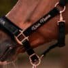 Handgefertigtes Halfter aus Gurtband eingefasst mit Velvet und Beschlägen in Rosegold oder Silber. So stabil wie ein Lederhalfter, so weich, dass du es die ganze Zeit anfassen willst.