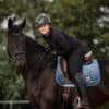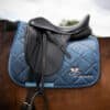 Anatomisch geformte Schabracke aus Velour. Gefüllt mit Schaumstoff und Volumenvlies für eine bessere Stoßabsorbation. Unterstoff aus 100% Baumwoll- Waffelpiqué, das den Schweiß schnell aufsaugt. Eingefasst mit farblich passenden Kordeln. Auf der linken Seite mit unserem Logo in bestickt.