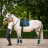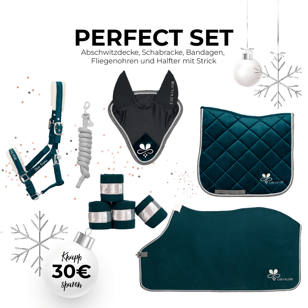 Dein perfectes Set für dich selbst oder zum Verschenken an Weihnachten. In Smaragd mit silbernen Details. Dein Set besteht aus Abschwitzdecke, Schabracke, Bandagen, Fliegenohren und passendem Halfter in Velvet Smaragd mit Führstrick in Silbergrau.