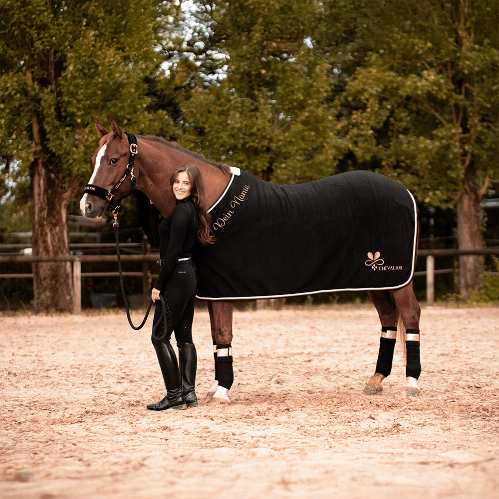 Dein perfectes Set für dich selbst oder zum Verschenken an Weihnachten. In Schwarz mit Details in Rosegold. Dein Set besteht aus Abschwitzdecke, Schabracke und Bandagen.